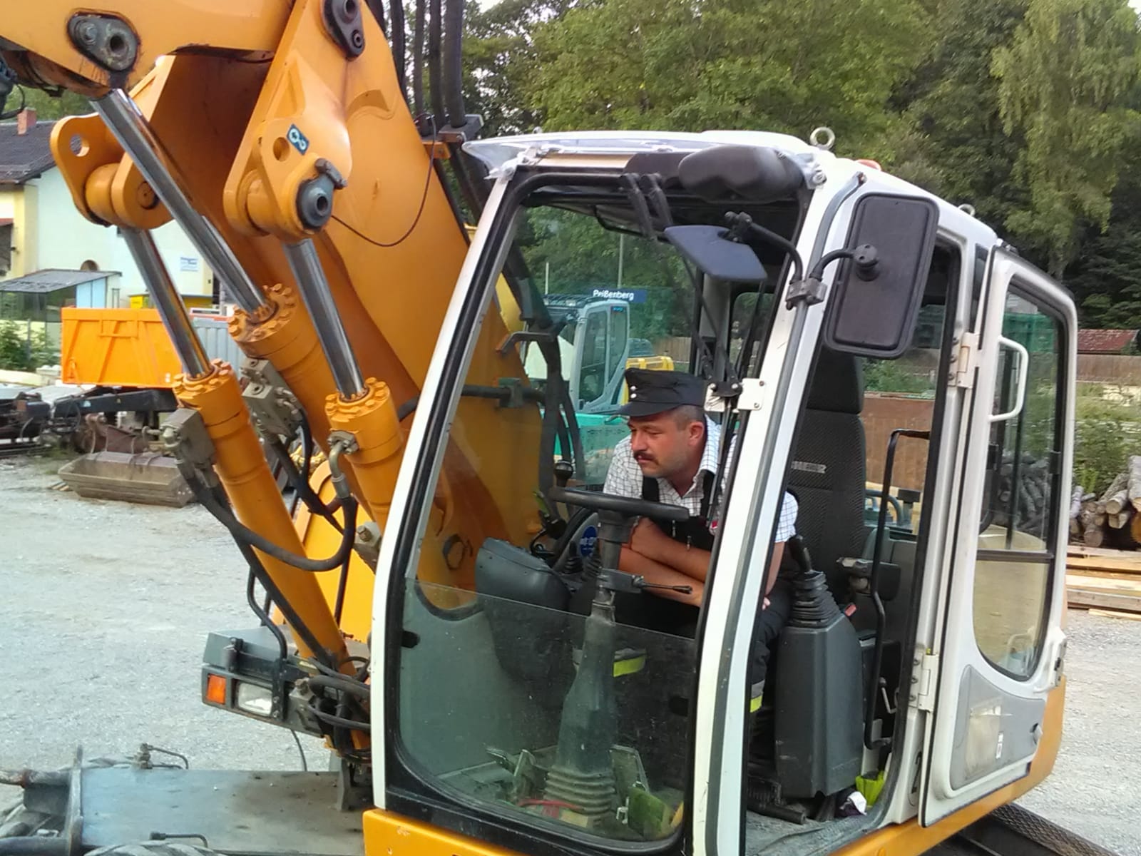 Zuerst verschafften sich alle einen groben Überblick über die Lage am Einsatzort, einer Baustelle. Eine Person (Puppe) lag bewusstlos und verschüttet in einem tiefen Kiesloch. Eine besondere Schwierigkeit stellte dabei der Sand da, welcher drohte, jeden Moment abzurutschen und die Person unter sich zu begraben. Gemeinsam versuchten deshalb alle Beteiligten, eine möglichst effektive und patientenschonende Lösung für die Rettung zu finden. Letztendlich wurden einige vorhandene Paletten an eine Seite des Lochs gelegt und mit Hilfe eines Baggers festgedrückt. Mit weiteren Paletten, einem Balken und einem Steckleiterteil wurden dann auch die anderen Seiten stabilisiert, um ein Abbrechen der Kante zu verhindern. Nun konnten auch zwei Feuerwehrmänner sicher zu dem Patienten hinabsteigen. Die Rettung der Person gestaltete sich jedoch weiterhin schwierig, da diese unter viel Sand begraben war und sich nur schwer befreien ließ.